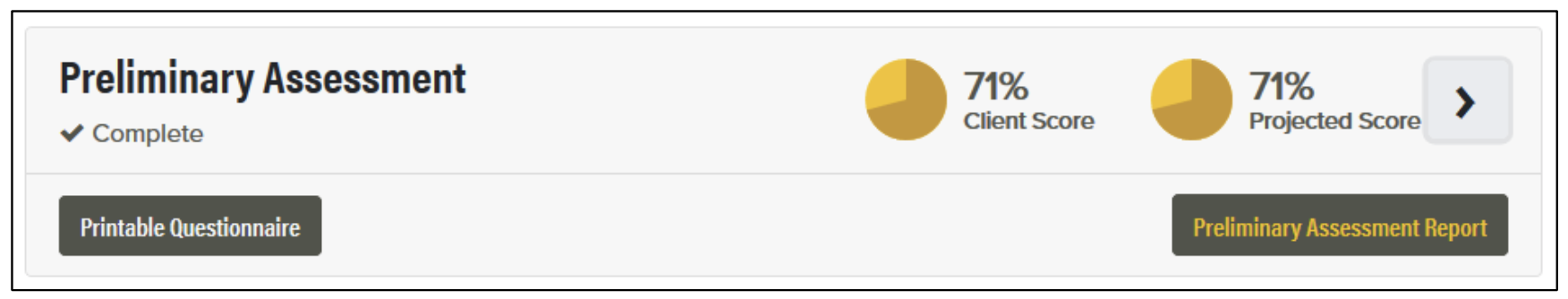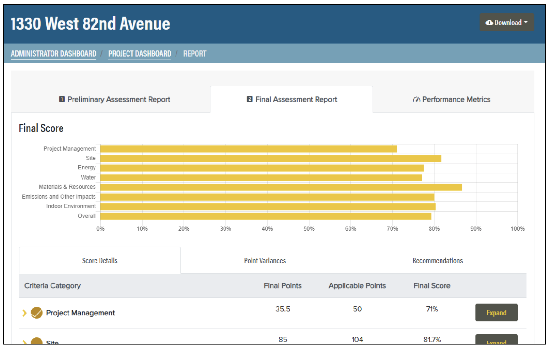 - Score Details table that expands/collapses to provide Project Points, Applicable Points, and Projected Score for each Assessment Area, Section, and Subsection